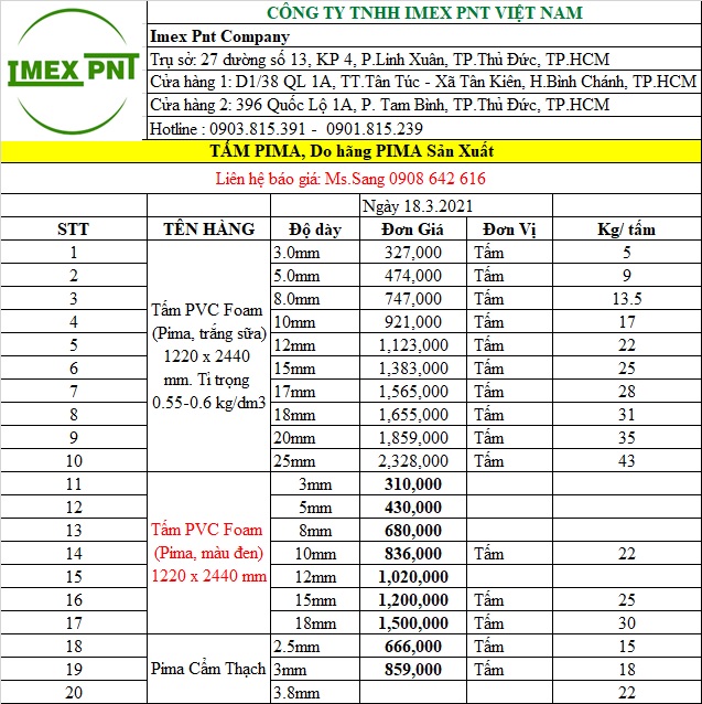 BẢNG BÁO GIÁ CHI TIẾT TẤM NHỰA PVC FOAM PIMA