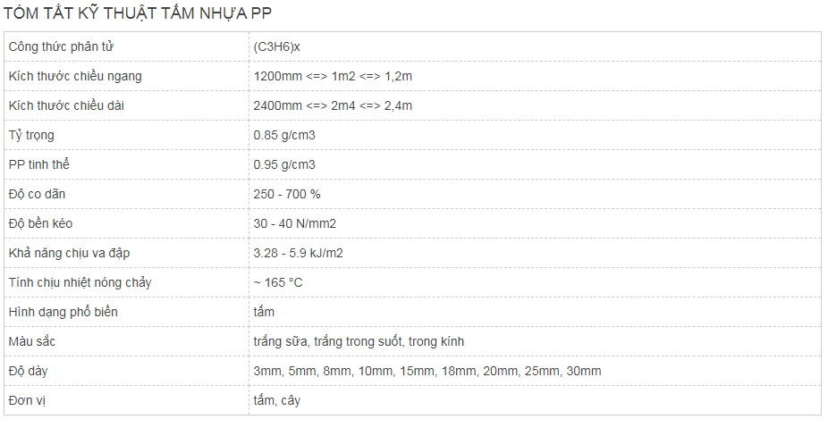 Nhựa PP tên tiếng anh là Polypropylen thông thường có dạng tấm với thành phần công thức hóa học là (C3H6)x màu trắng sữa đạt độ bền cơ học cao giống với nhựa kỹ thuật ở chỗ khá cứng vững, không mềm như nhựa PE, không bị kéo giãn dài do đó được chế tạo thành sợi. Nhựa PP tấm chịu nhiệt độ cao đến hơn 100 độ C, không mùi, không màu và có an toàn cho sức khỏe nên còn hay được dùng trong công nghiệp chế biến thực phẩm và được dùng nhiều trong sản xuất gia công nội thất.